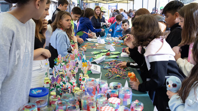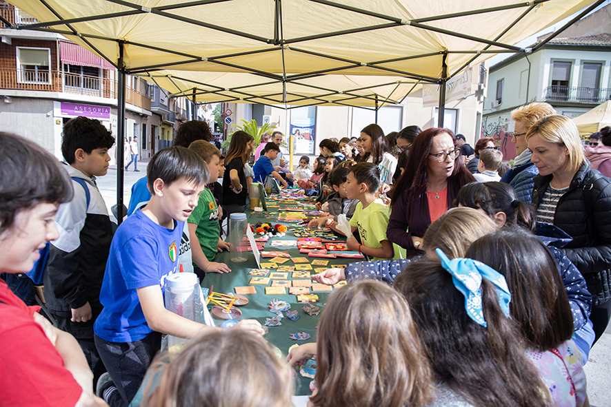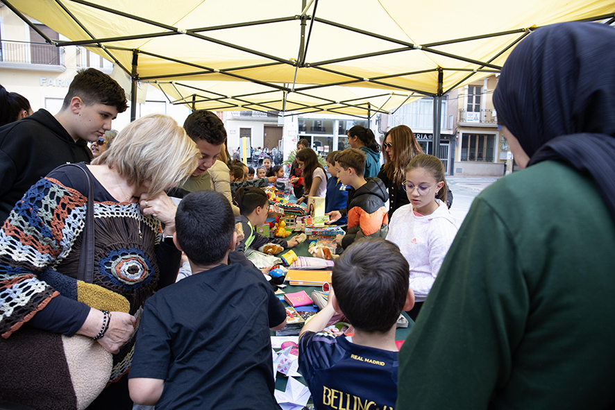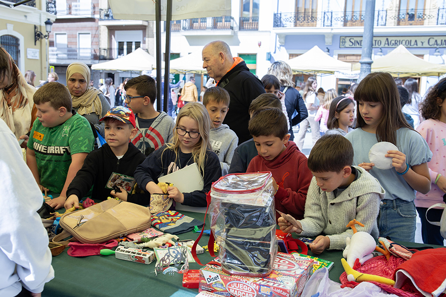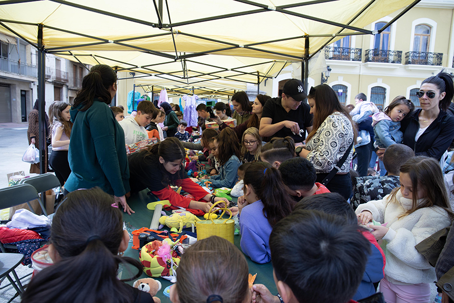 Desde las 10:00 el alumnado de 6º de Primaria de los CEIP Vicente Blasco Ibáñez, Francisco Giner de Los Ríos y Ana Lluch y el colegio San José de la Montaña han puesto a la venta todo tipo de artesanías y objetos usados, atrayendo a gran cantidad de compradores y compradoras. «Tengo dos nietas que están vendiendo con mucha ilusión cosas elaboradas por ellas mismas y yo he venido a comprar porque siempre me gusta colaborar con iniciativas que tienen una buena causa», apuntaba María José Abellán, vecina de la población.