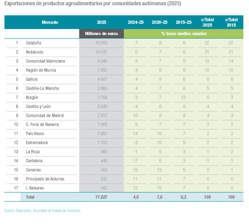 Por comunidades autónomas, Cataluña recupera en 2025 el primer puesto, con 16.900 millones de euros y un crecimiento del 7 %, adelantando a Andalucía con 16.031 millones, cuyo crecimiento nulo responde a la caída en valor de las exportaciones de aceite de oliva. La Comunidad Valenciana (9.943 millones, +8 %), la Región de Murcia (7.552 millones, + 4 %) y Galicia (4.607 millones, + 4 %) completan el grupo de los cinco primeros.