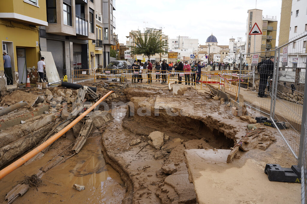 Cristina, ante un puesto improvisado de reparto de alimentos y agua explicaba que iniciaron su tarea «el primer día, el miércoles, con donaciones como la de la Falla de Patraix y de gente de Vilamarxant, de La Pobla, de Buñol, de Cheste que nos trajeron alimentos, productos de primera necesidad y elegimos este punto porque es uno de los barrios más afectados y está incomunicado por el socavón de la calle Ramón y Cajal con personas mayores y con un enorme bloque de viviendas todas desalojadas por amenaza de derrumbe».