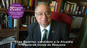 “Estoy aquí porque mis compañeros y compañeras, afiliados o no a IU, me lo han pedido y será para mi un orgullo formar parte de un cambio importante en mi pueblo”, Elías Ramírez, de 59 años de edad, nació en Requena y cursó sus estudios de Derecho en la Universidad de Valencia, fue Consejero Adjunto de Cooperativas de la Organización Internacional del Trabajo (OIT) para toda America Latina y Caribe, Profesor de la Universidad Austral en Buenos Aires, Presidente del Sporting Club Requena y miembro fundador del Ateneo Republicano Requenense.