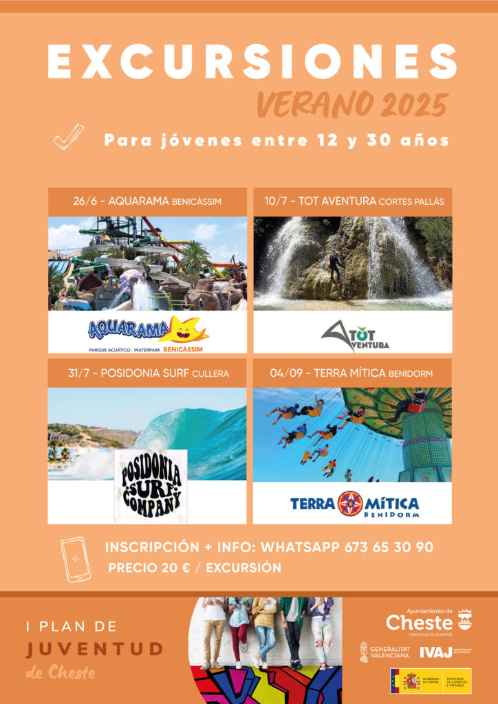El 26 de junio, jueves, la excursión será al parque acuático Aquarama, en Benicàssim; el 10 de julio, al parque multiaventura Tot Aventura, en Cortes de Pallás, y el 31 de julio, a la escuela de surf Posidonia, en Cullera. La última de todas se ha organizado con fecha de 4 de septiembre, y será a Terra Mítica, en Benidorm.