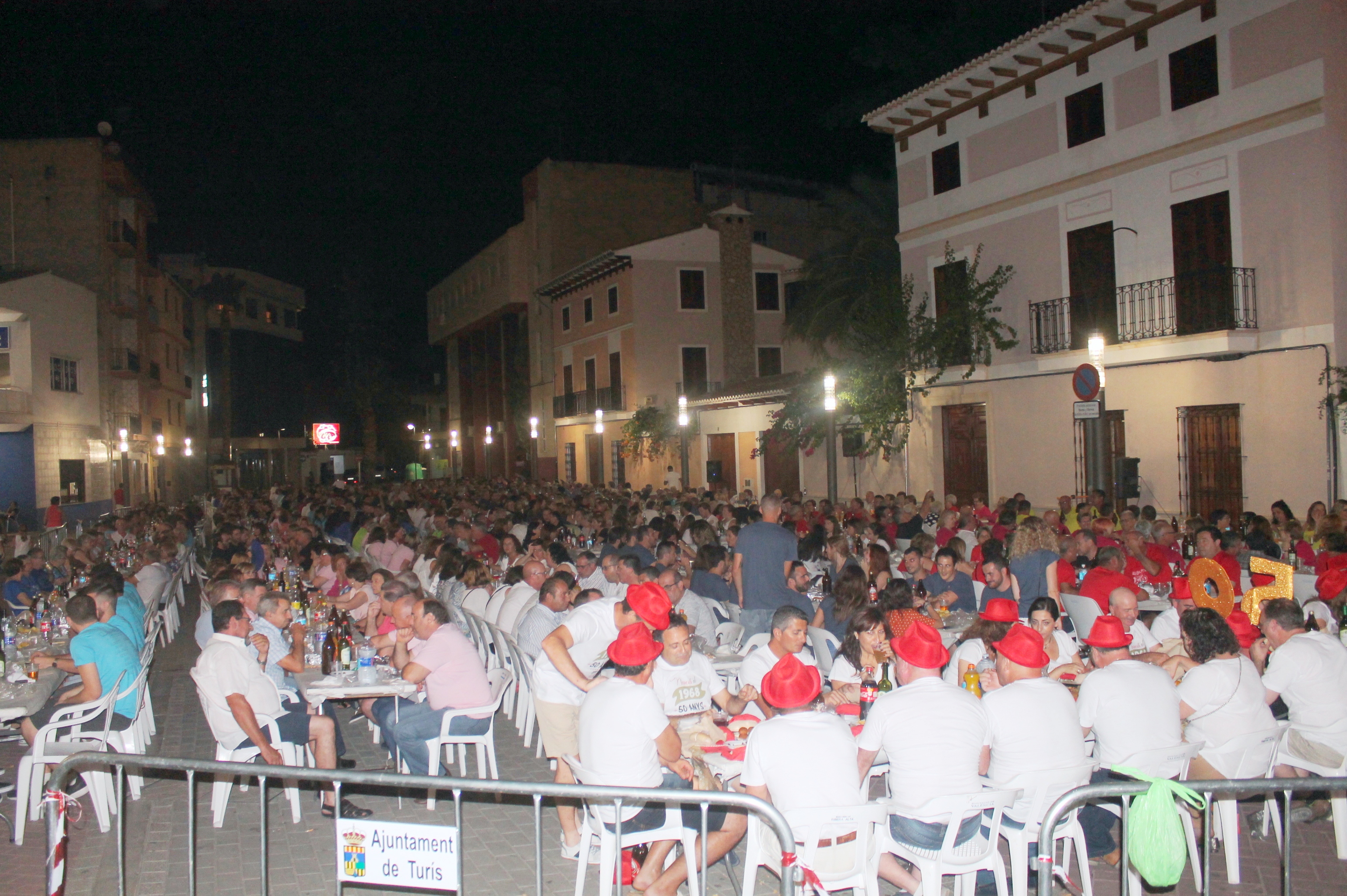 Armonía y buen humor es lo que se vive todos los años en la cena de quintas de Turís. Una cita que con sólo tres años se ha consolidado de manera firme en el calendario de las fiestas del pueblo. Algo más de mil personas se concentraron en la Plaza Vicent Ribes abarcando desde la quinta del 34 hasta la del 2001. El límite de edad se difuminó a la hora de pasarlo bien en una noche donde también cobraron especial protagonismo las quintas que cumplen 25 y 50 años.