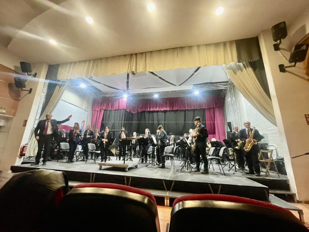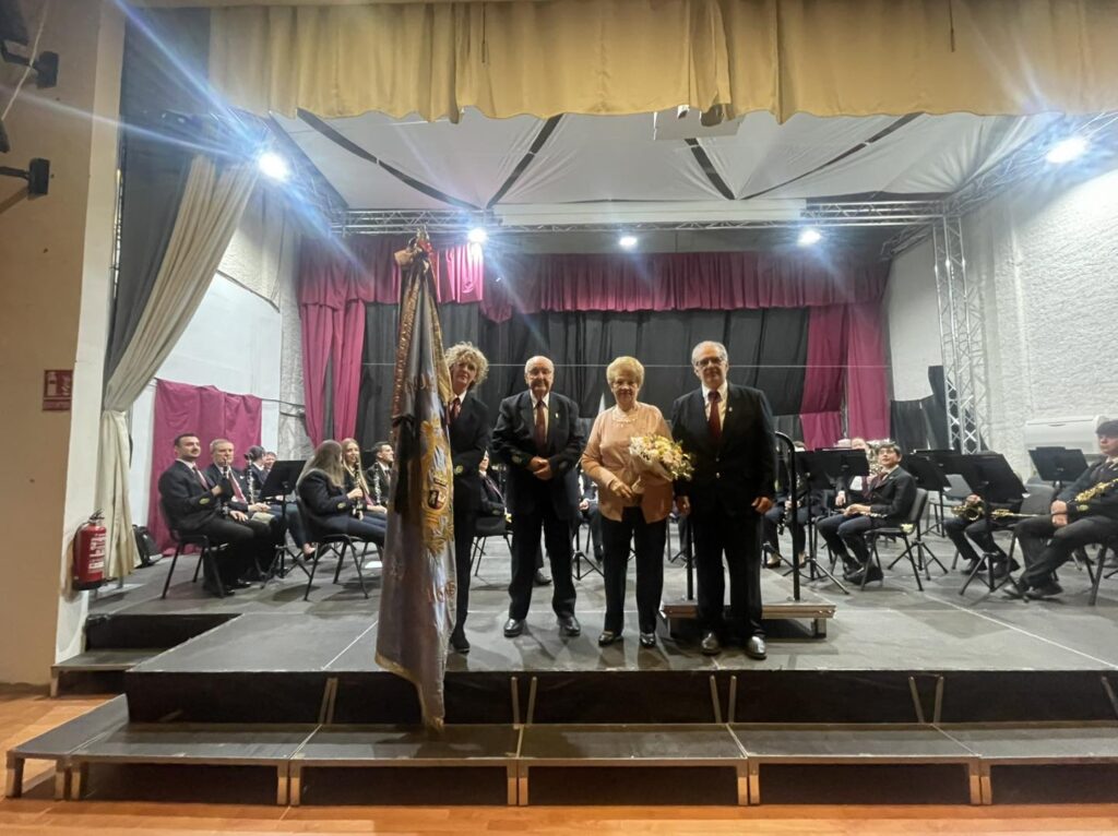 El concierto, marcado por un ambiente de unión y fraternidad, tuvo su momento más emotivo durante el descanso. Los padrinos de la bandera, Angelita y Jaime, realizaron la imposición de un nuevo banderín conmemorativo de los 10 años de la sociedad musical. El banderín, bordado por Angelita, fue recibido con aplausos y entusiasmo por los asistentes.