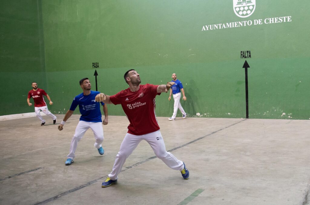 El pasado sábado, 22 de julio, el frontón barón de Cheste acogió una partida de pelota valenciana de primera categoría en el marco de la celebración de las Fiestas de Julio. Los jugadores que se disputaron el encuentro fueron Juan Tarín y Álvaro Arnau, de rojo, y René Balaguer y Juanjo Gálvez, de azul.
