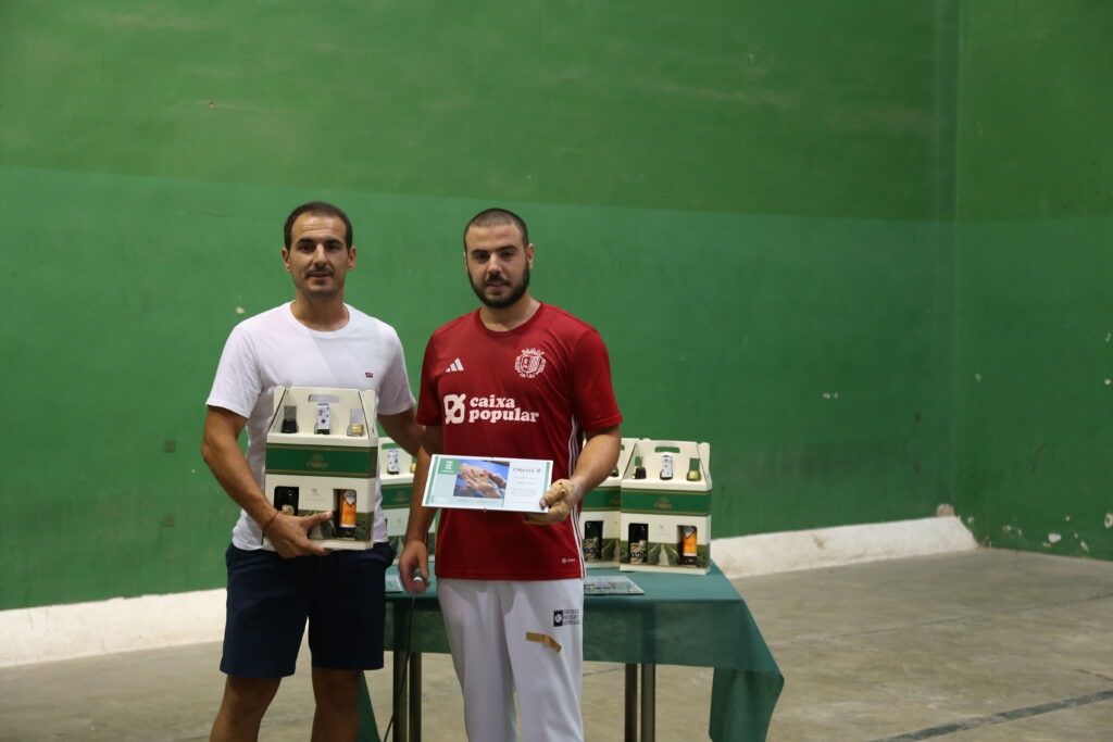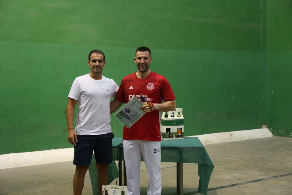 Antes de dar comienzo a la partida el concejal de Deportes, Adrián Tarín, se presentó ante el público del frontón e hizo entrega a los jugadores de un diploma y un estuche de vino, en agradecimiento por su participación.