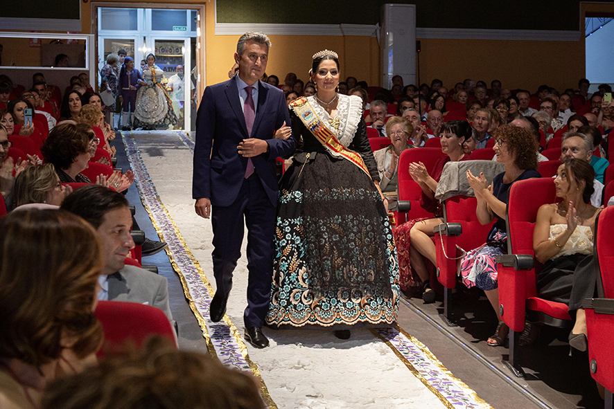 Ya en el trono, Paola de la Cruz Soriano recogió el testigo de la reina saliente y recibió la insignia de oro del Ayuntamiento de manos del alcalde, junto a un pergamino conmemorativo de su reinado. Además, el concejal de Fiestas, Óscar Galdón, entregó un ramo de flores a Ángela Morell, en nombre del Ayuntamiento.