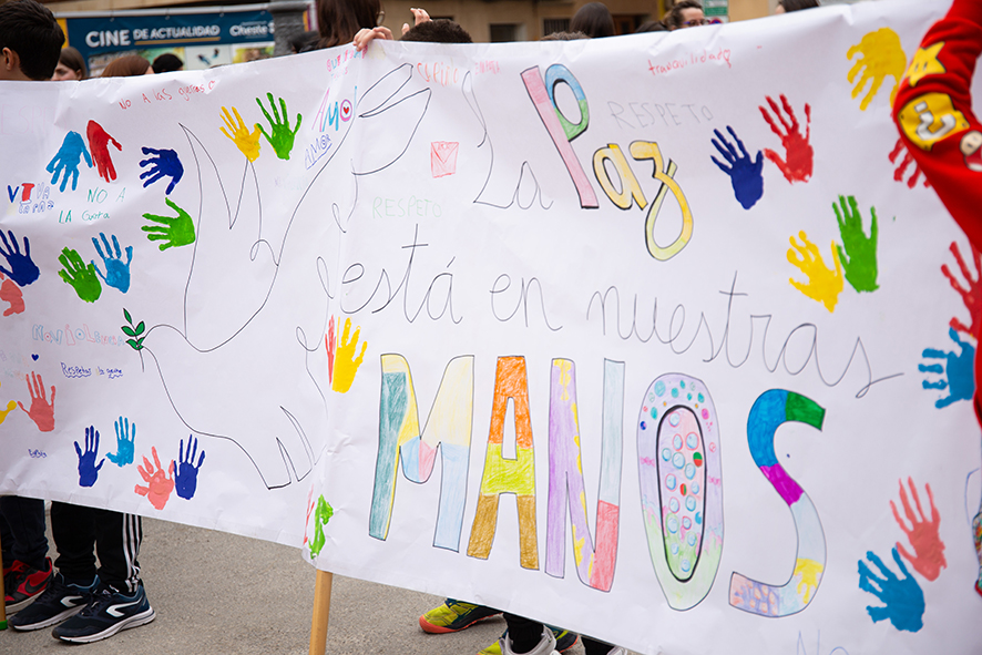 Tras las lecturas, todos y todas han cantado y bailado la canción Color esperanza, junto con los vecinos y vecinas que se han sumado al acto, y han realizado una marcha por el centro urbano con pancartas y mensajes pacifistas.