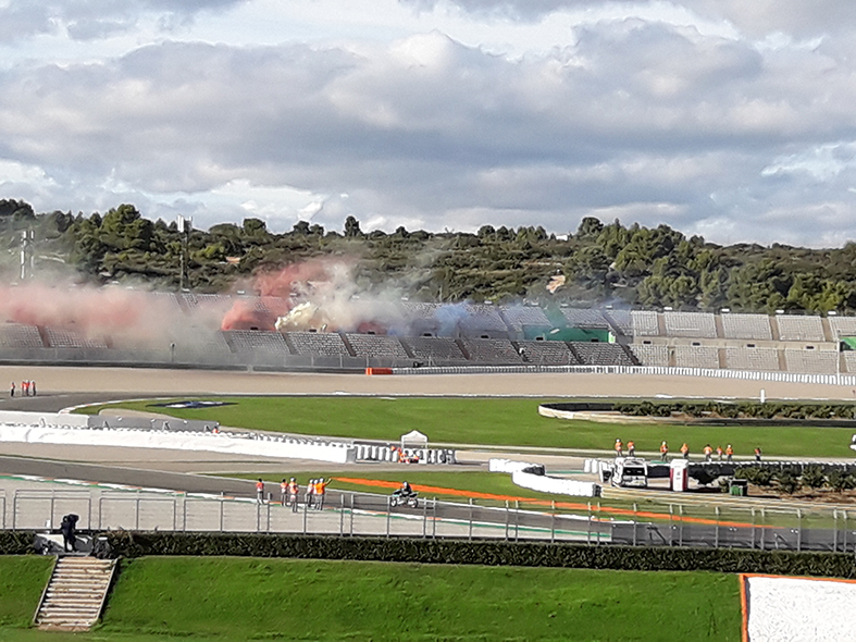 La traca de un kilómetro que ocupó toda las gradas Azul, Verde, Roja y Blanca como homenaje a la afición, la gran ausente (muy a su pesar) debido a las circunstancias excepcionales en la que nos encontramos. El encargado de encender la citada traca fue el nuevo y merecido campeón del mundo de MotoGP Joan Mir. Resaltar que hace unos años pasó por la Cuna de Campeones, el gran semillero que tenemos en la Comunidad Valenciana de la que no cesan de salir campeones del mundo.