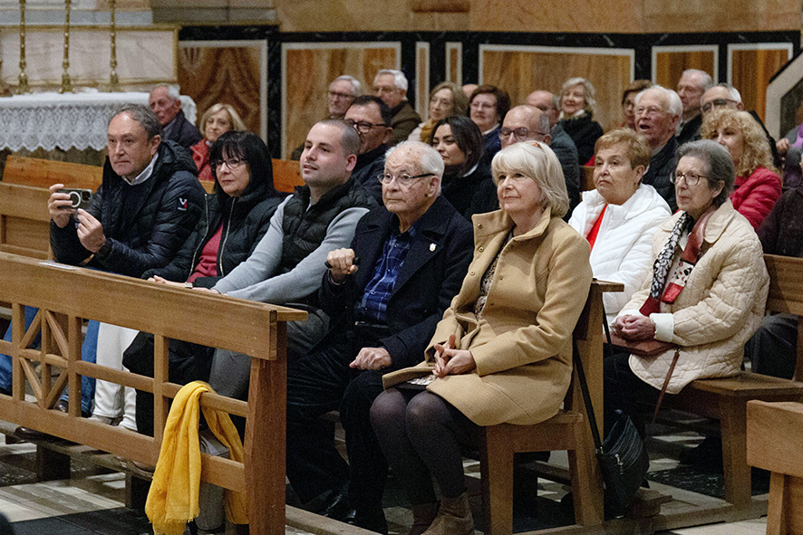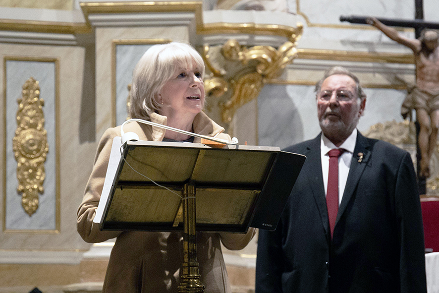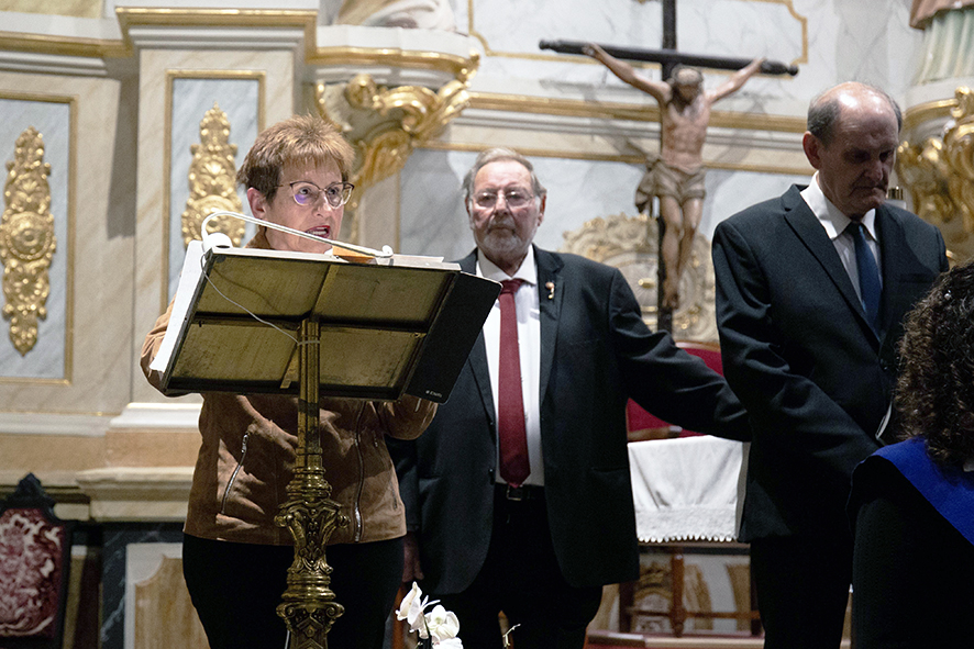 Mª José Sánchez, hija del Francisco Sánchez, intervino para hacer un agradecimiento a todas las personas implicadas en el homenaje. “Hoy mi padre está muy emocionado por tener a tanta gente alrededor que le quiere y que está siguiendo su trayectoria. Gracias a la coral por haber sido su compañera y su ilusión por más de 60 años y por tantísimo esfuerzo para este concierto homenaje, especialmente por parte de su director, Gustavo López, y su presidente, Miguel Ángel Balaguer; agradecer también al párroco, Don Antonio, todas las facilidades que nos dado para hacer este concierto en este sitio tan especial y, por último, al ayuntamiento, en la persona de Mª Ángeles Llorente, por todo el interés que ha puesto en la edición de este pequeño libro y por aportar todo lo necesario para la realización de este evento”, manifestaba la hija del homenajeado.