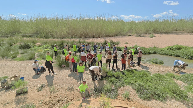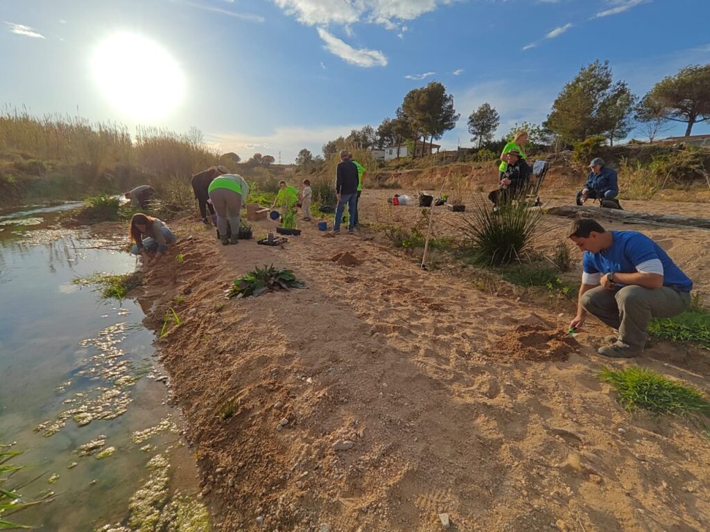 Durante la jornada, se ejecutó un diseño de plantación estratificado en ambos márgenes del cauce. La intervención consistió en la reintroducción de diversos estratos vegetales: macrófitos helófitos (Iris pseudacorus, Scirpus spp.), especies arbustivas termófilas como la murta (Myrtus communis) y el lentisco (Pistacia lentiscus), y estratos arbóreos característicos de la vegetación de ribera, incluyendo sauces (Salix spp.), fresnos (Fraxinus angustifolia), tarays (Tamarix spp.) y espinos blancos (Crataegus monogyna). Esta acción de revegetación estratégica busca restaurar la funcionalidad ecológica del ecosistema y consolidar la estabilidad de los márgenes fluviales.