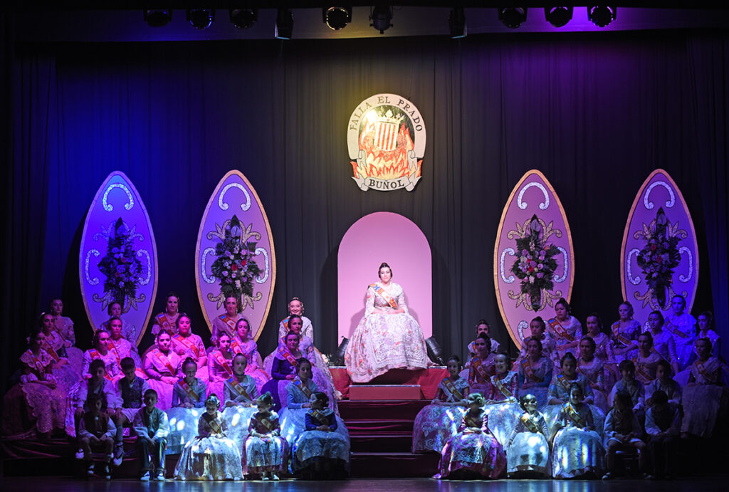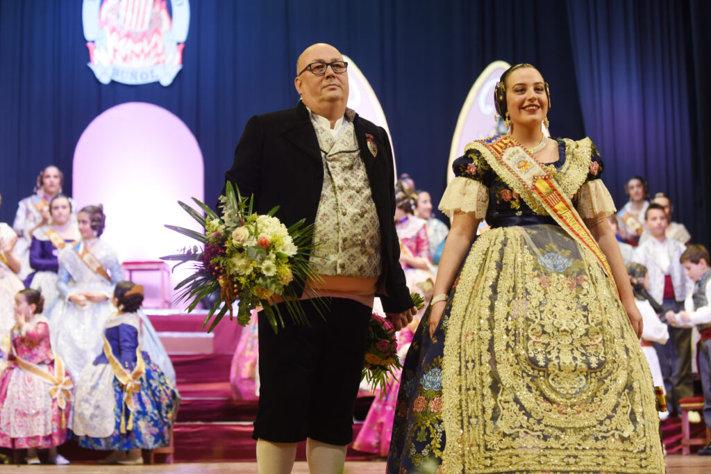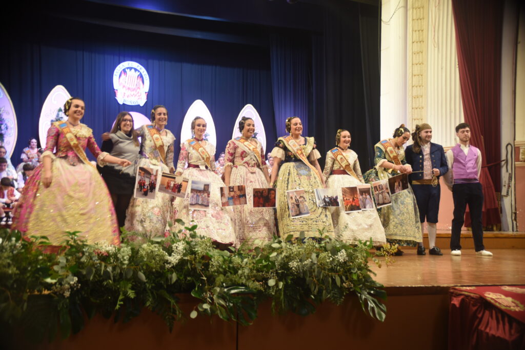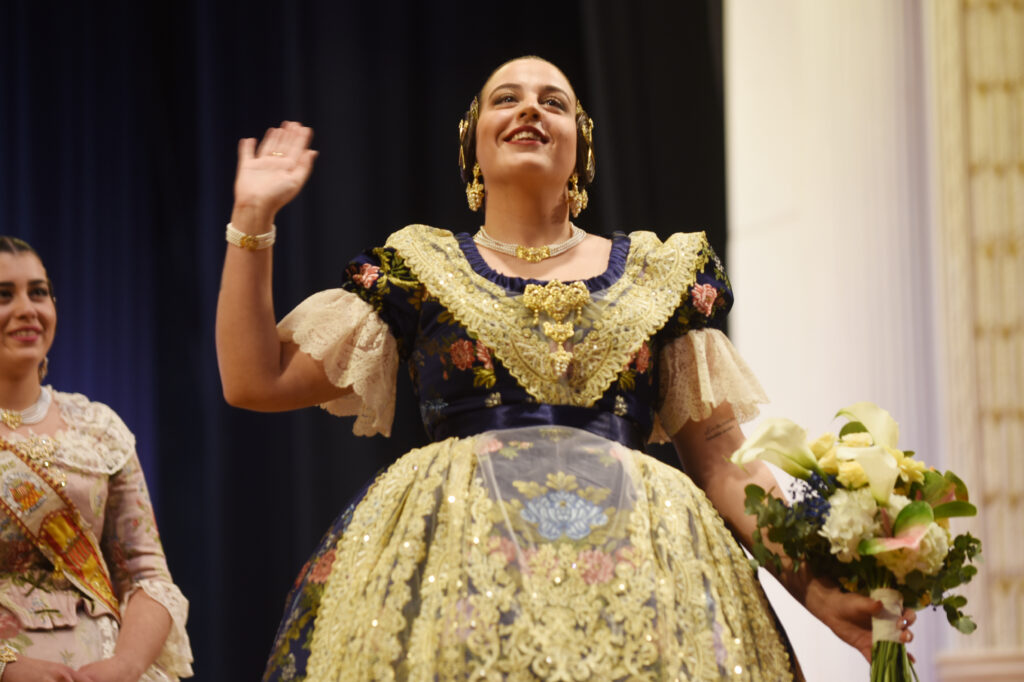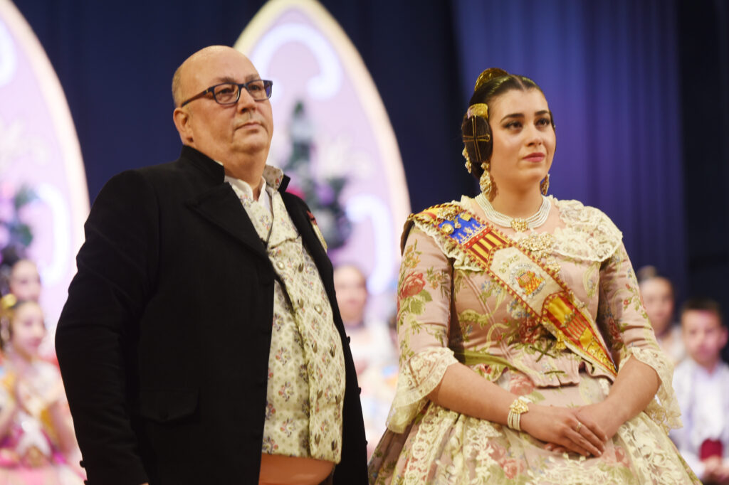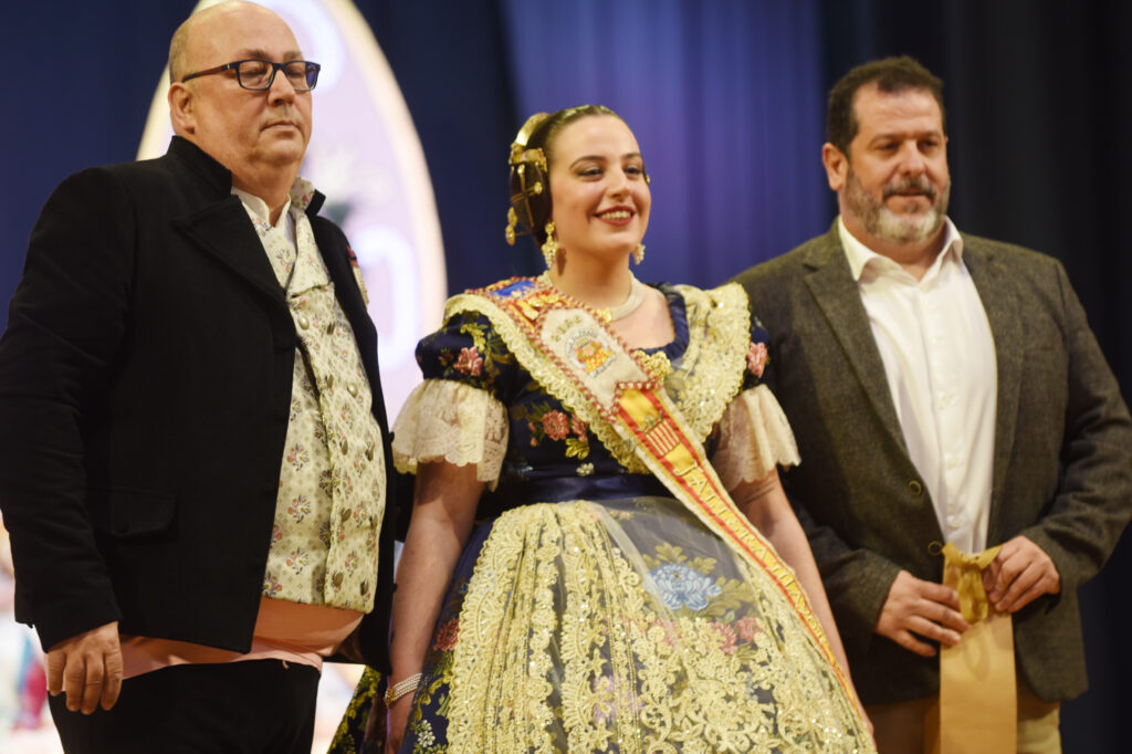 La protagonista de la noche fue recibida sobre el escenario por la Fallera Mayor saliente, Dafne Font Gutiérrez, y por el presidente de la comisión, Francisco Monteagudo, en un acto cargado de simbolismo y emoción que reunió a numerosos falleros, familiares y vecinos.