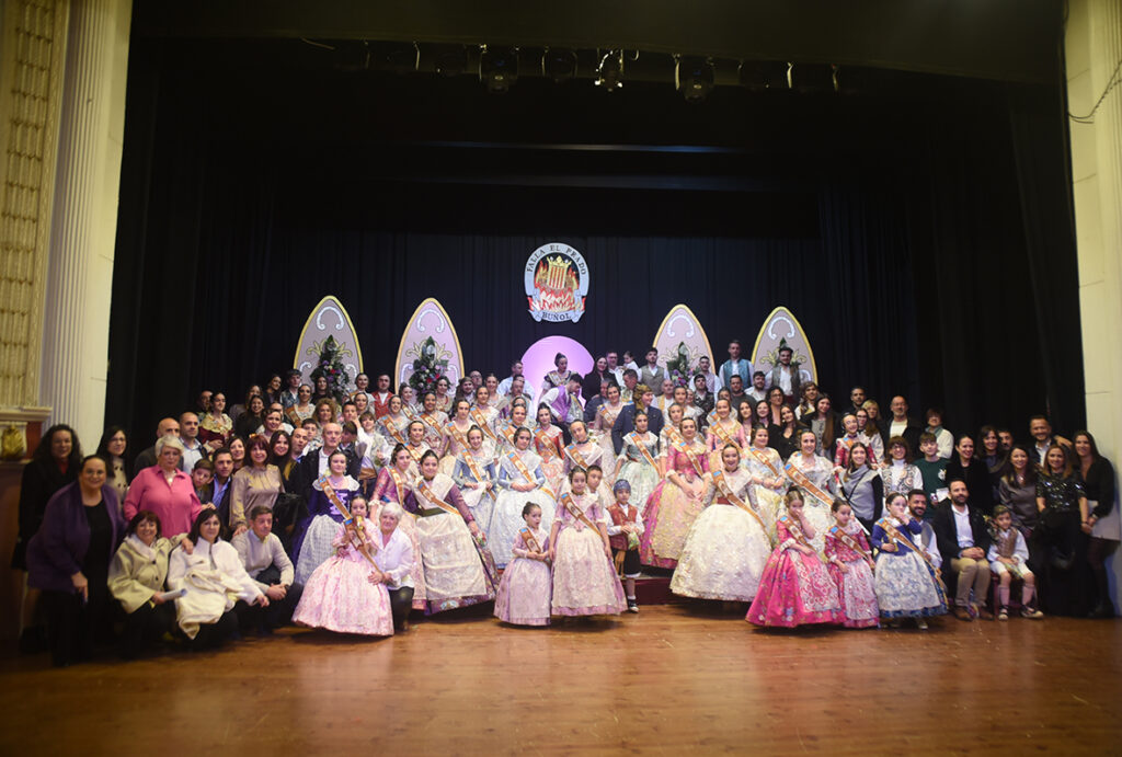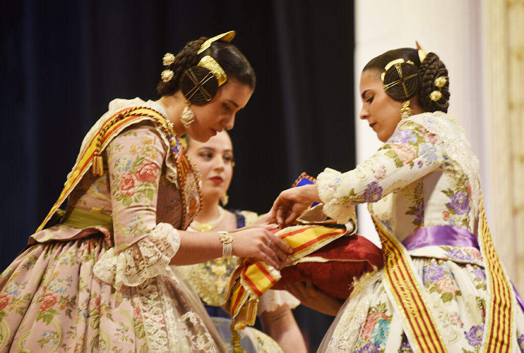 La ceremonia se inició con el desfile de las falleras y falleros que integran la Corte de Honor, quienes fueron ocupando el escenario hasta conformar una imagen colectiva que reflejaba la unión y el trabajo de toda la comisión. Con el escenario ya completo, llegó uno de los momentos más esperados: la imposición de la banda a Lídia, que accedió visiblemente emocionada y fue recibida con una calurosa ovación del público.