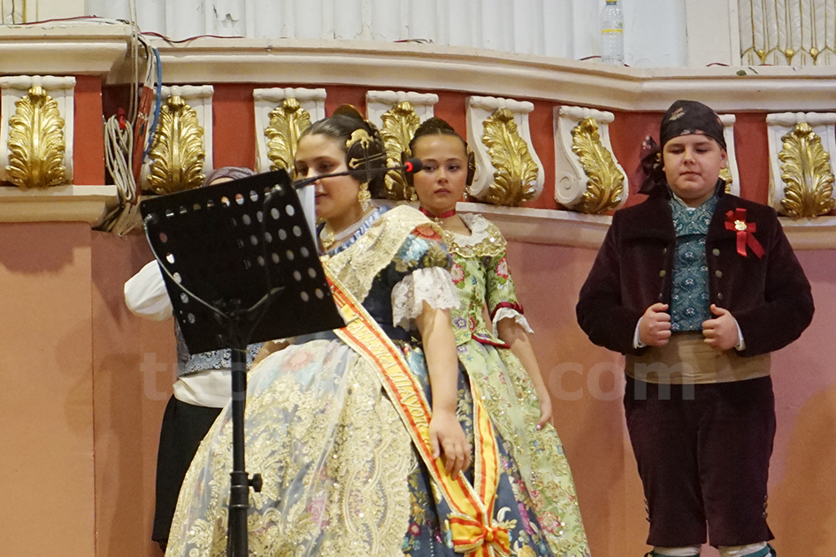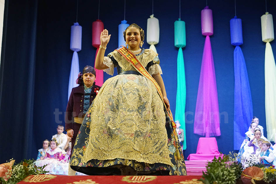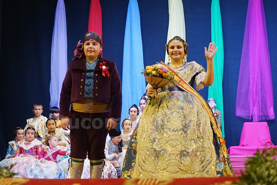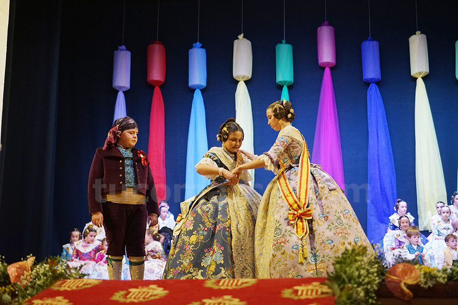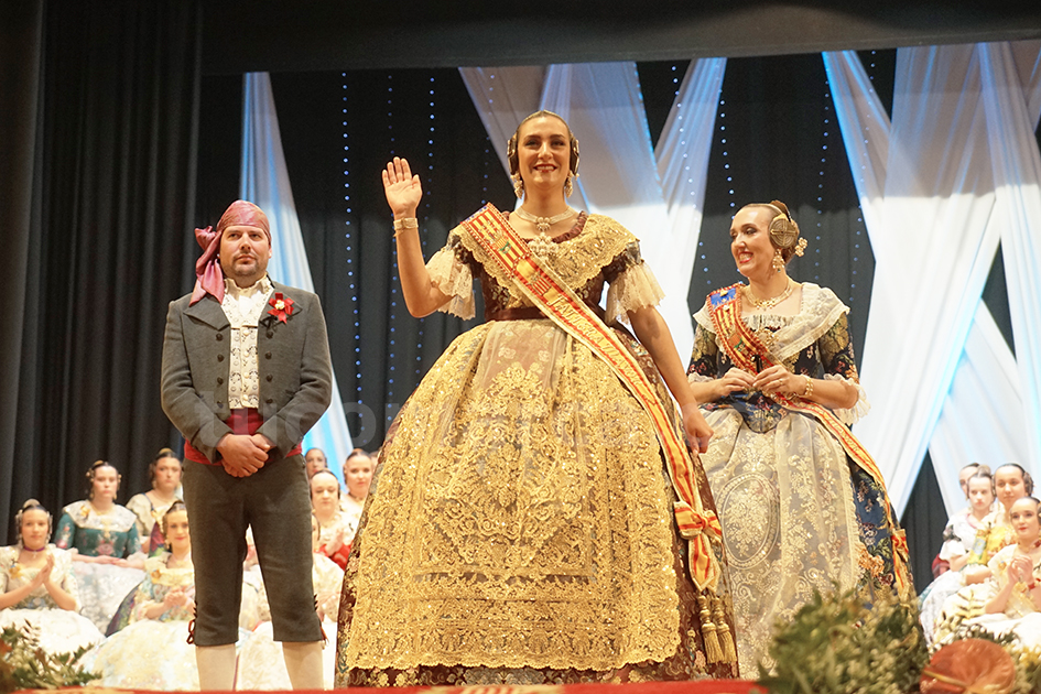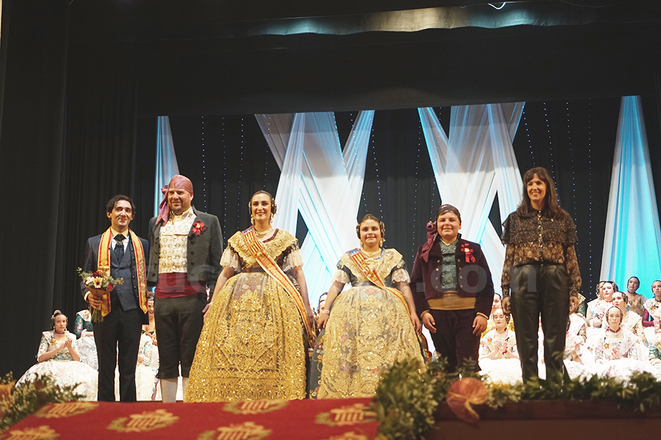 La primera parte del evento ha tenido como protagonistas a los más pequeños de la comisión. Carmen Valls Llorens, quien ha sido nombrada Fallera Mayor Infantil, ha desfilado emocionada por el pasillo acompañada de su abuelo. Ya en el escenario, Carmen ha recibido la banda que la acredita como Fallera Mayor Infantil, así como el cuadro conmemorativo de la presentación. Este momento ha sido especialmente emotivo, ya que Paula Carreño Rehués, la Fallera Mayor Infantil saliente, ha aprovechado la ocasión para despedirse con unas palabras de agradecimiento a su familia y a la comisión.
