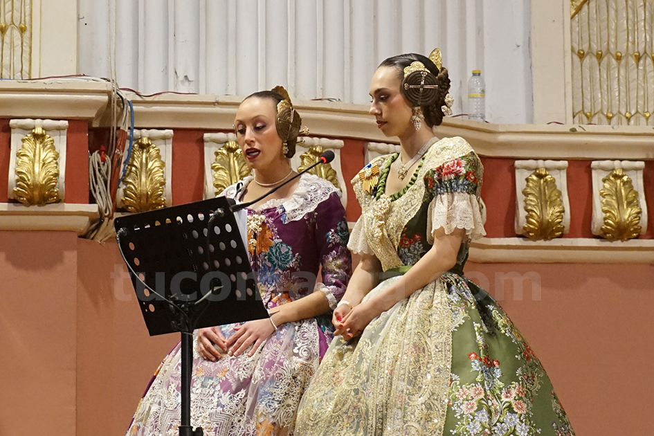 En la segunda mitad del acto, ha sido el turno de Raquel Cámara Perelló, la nueva Fallera Mayor de la comisión. Raquel ha recorrido el pasillo del teatro con gran emoción, acompañada de su tío, y ha sido recibida por el presidente de la comisión, Raúl Parla Villanueva, y la Fallera Mayor saliente, Sara Carrascosa Criado. Sara también ha aprovechado para despedirse con un emotivo discurso, destacando su gratitud hacia su familia y la comisión.