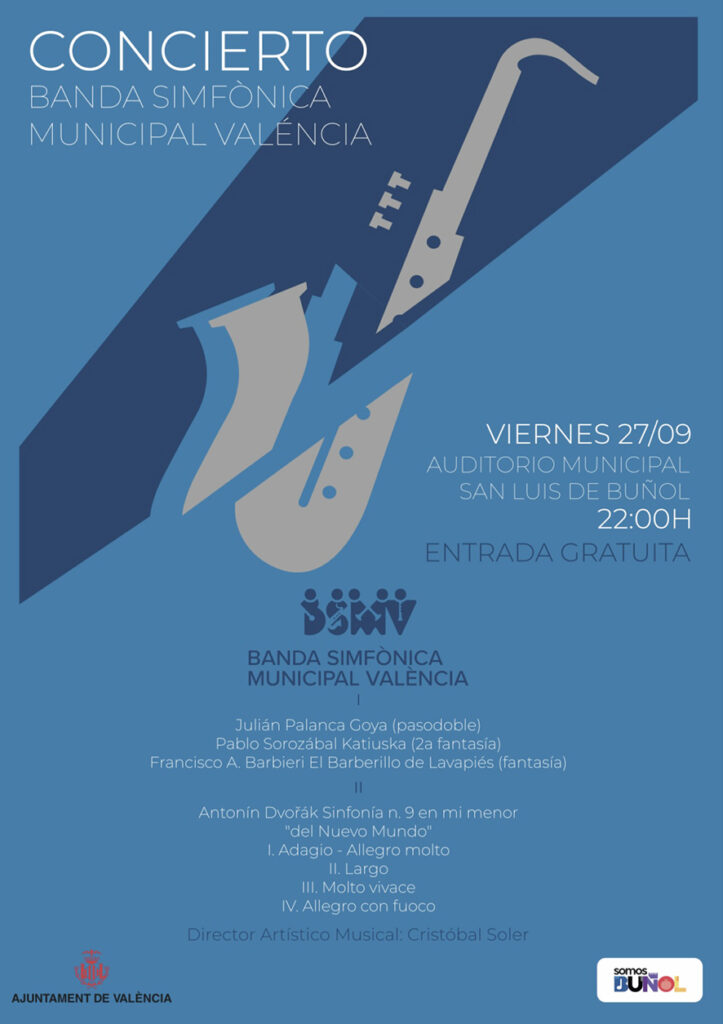 Este viernes 27 de septiembre, la Banda Sinfónica Municipal de Valencia actuará en el Auditorio de San Luis a las 22:00 h, con un programa variado y lleno de grandes composiciones. La entrada será gratuita para todos los asistentes. El concierto, bajo la dirección de Cristóbal Soler, comenzará con el pasodoble Goya, de Julián Palanca, seguido de la 2ª fantasía, de Katiuska, de Pablo Sorozábal y la fantasía de El Barberillo de Lavapiés, de Francisco A. Barbieri.