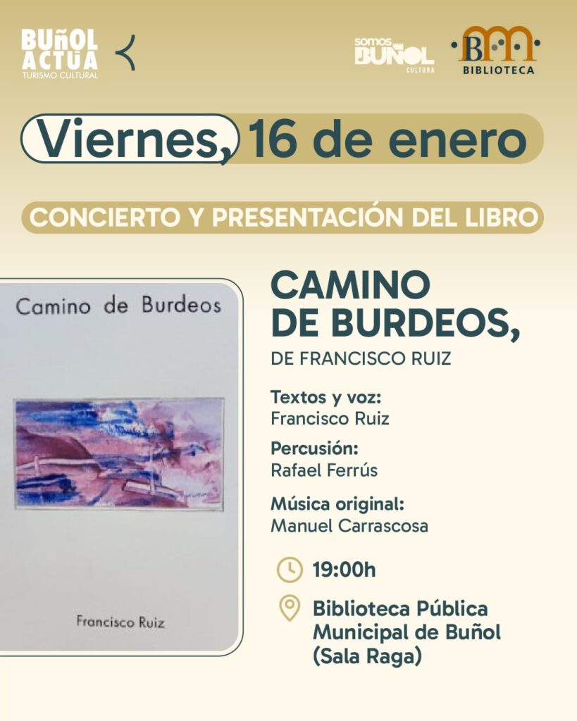 La Biblioteca Municipal de Buñol será escenario este viernes, 16 de enero, de un concierto-recital con motivo de la presentación de la última obra literaria de Francisco Ruiz.