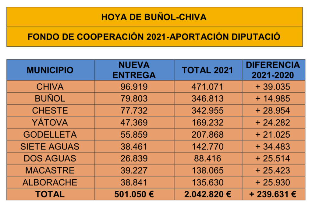 La Diputació de València prepara una tercera entrega del Fondo de Cooperación Municipal que repartirá 500.000 euros entre los municipios de La Hoya de Buñol-Chiva. En total, la institución provincial ha asignado 2.043.000 euros a la comarca a lo largo del presente año en el marco del Fondo de Cooperación, lo que supone un incremento de 240.000 euros respecto a la aportación de 2020.