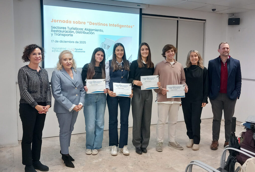 Al finalizar el evento, la jefa del Centro de Turismo de la Diputació y el responsable de Valencia Convention Bureau han hecho entrega de premios a los tres mejores proyectos de Turismo Inteligente de final del Doble Grado en Turismo y ADE de la UV, seleccionados entre nueve finalistas.