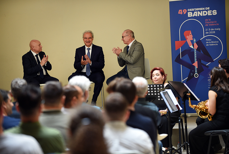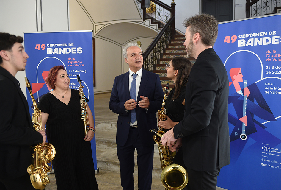 La Diputación demuestra un año más su implicación con la música de banda, y van 49, lo que supone estar “en vísperas de un 50 aniversario que será muy exclusivo y al que llegamos con una respuesta masiva de las sociedades musicales”, destaca el diputado de Bandas de música, Ricardo Gabaldón. Él ha sido el anfitrión de la puesta en escena del Certamen de Bandas que se celebrará el 2 y 3 de mayo en el Palau de la Música, el primero en tomar la palabra tras los acordes de ‘La vida es bella’ y ‘Cinema Paradiso’ interpretados por el cuarteto Elle Sax. “Qué mejor manera de presentar la música que disfrutando de ella…”