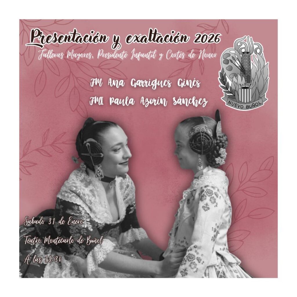 La Falla Nuevo Buñol celebrará este sábado, 31 de enero de 2026, a las 18,30 horas, en el Teatro Montecarlo, uno de los actos más esperados de su calendario fallero: la Presentación y Exaltación de las Falleras Mayores 2026, junto al presidente infantil y sus Cortes de Honor.