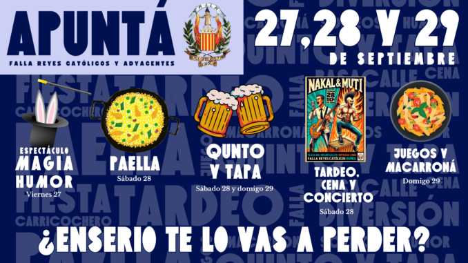 La Falla Reyes Católicos ha preparado este próximo fin de semana repleto de diversión y eventos pensados para todos los públicos. Las actividades de «La Apuntá» comenzarán el viernes por la noche con una cena de sobaquillo, acompañada de un espectáculo de magia y humor, además de sorteos gracias a comercios colaboradores.