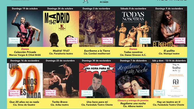 Dentro de concurso, 5 compañías amateurs de diferentes puntos de la geografía española se darán cita en Cheste para participar en la muestra: Paraskenia teatro, con Madrid 19-67; Comboi Mediterrani, con Escríbeme a la tierra; Maniquí teatre, con El Pollito; Stres de Quatre, con Que 20 años no es nada, y Ariba Teatro, con Torito Bravo. La muestra se clausurará el domingo 7 de diciembre con Regálame esta noche, de Albena Teatro, una comedia romántica que narra el reencuentro de dos viejos amantes.
