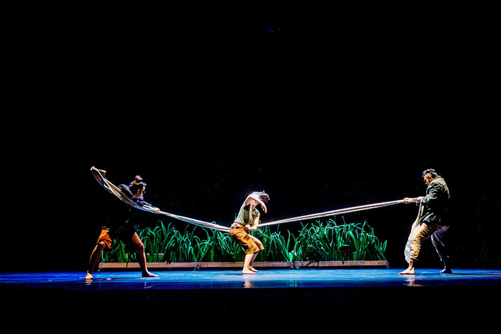 ‘Arròs’ se construye a partir de la coreografía de movimientos acrobáticos inspirados en las formas y movimientos de la naturaleza, como el crecimiento ascendente y cíclico de las semillas, y a su vez en las costumbres y tradiciones locales relacionadas con el cultivo del arroz.
