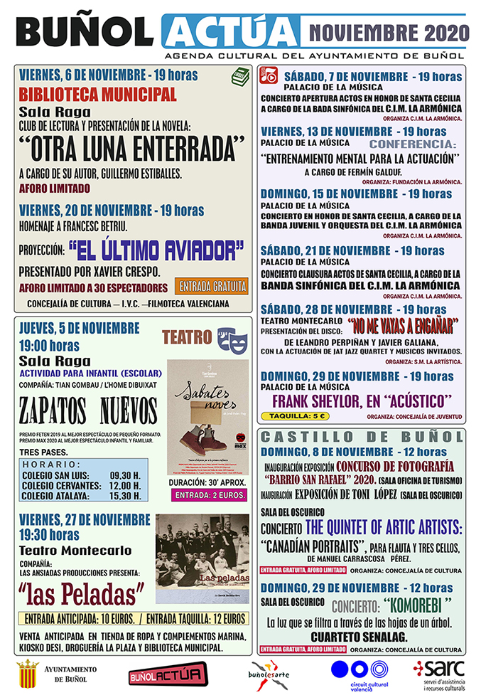 Dentro de la programación de la agenda cultural de la concejalía de Cultura del Ayuntamiento de Buñol, «Buñol Actúa», se han programado los siguiente actos culturales que se sucederán durante todo el mes de noviembre y que comenzarán el próximo jueves, 5 de noviembre, con teatro infantil en la Sala Raga y continuarán también en la Sala Raga el viernes, 6 de noviembre, con la presentación del nuevo título del escritor afincado en Buñol, Guillermo Estiballes, que dentro del Club de Lectura organizado por la Biblioteca Pública Municipal, el propio autor presentará al público «Otra luna enterrada», novela inspirada en escenarios y personajes de la localidad.