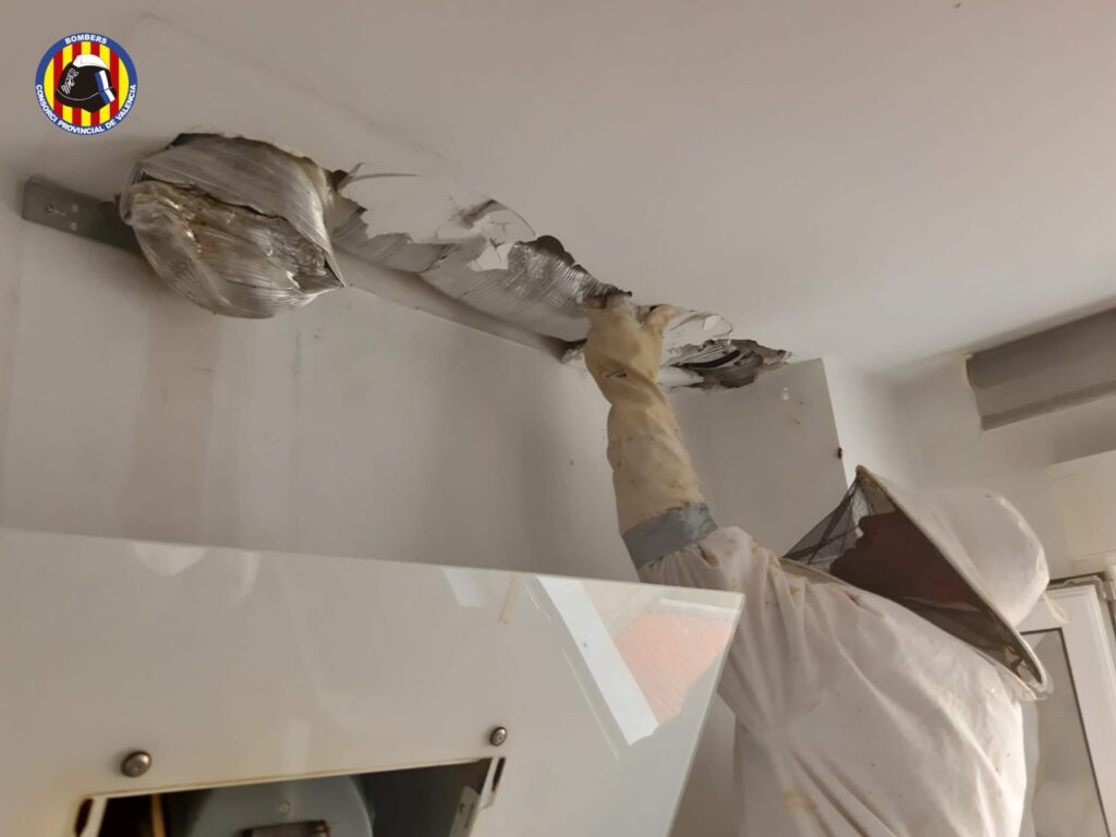 El equipo de Bomberos de Requena ha retirado este fin de semana una colmena de abejas situada en el tubo extractor de la cocina en una vivienda de la localidad de Utiel. El único acceso factible era mediante la retirada de la campana extractora.