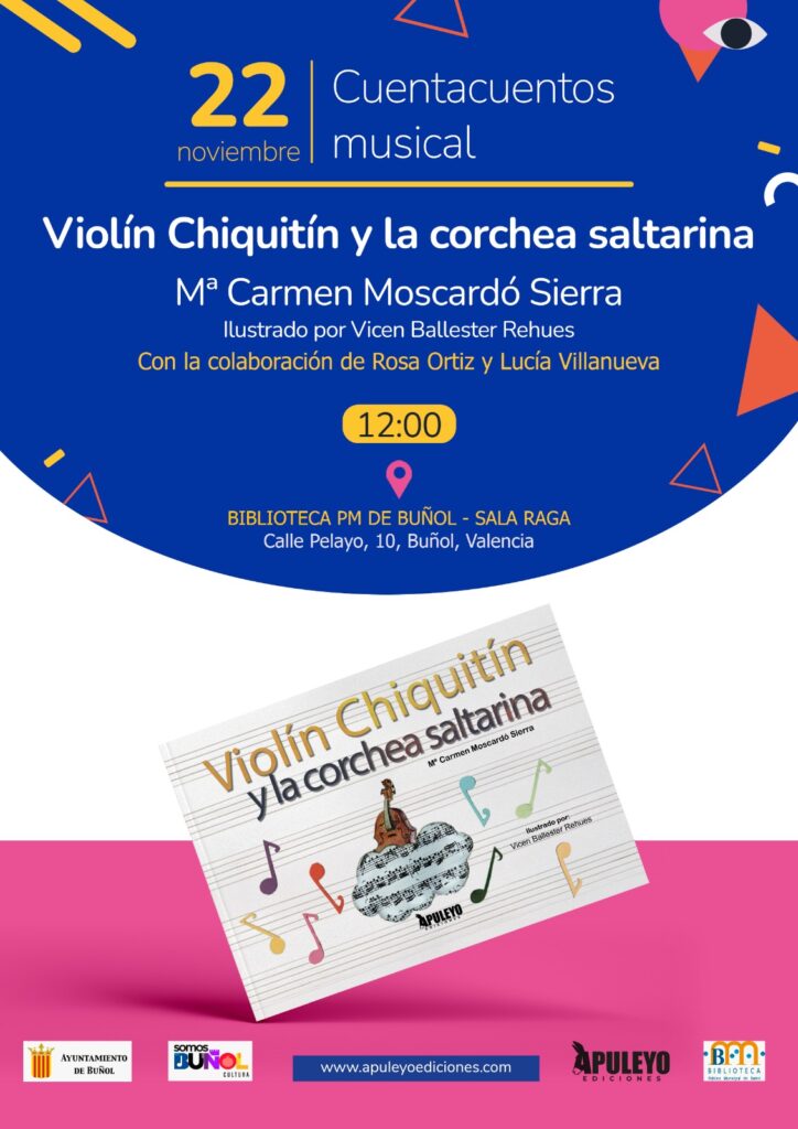 La Biblioteca Pública Municipal de Buñol será el escenario el próximo 21 de noviembre de la presentación literaria de “Violín Chiquitín y la corchea saltarina”, el libro infantil escrito por la docente Mª Carmen Moscardó Sierra. El acto comenzará a las 19,00 horas en la Sala Raga.