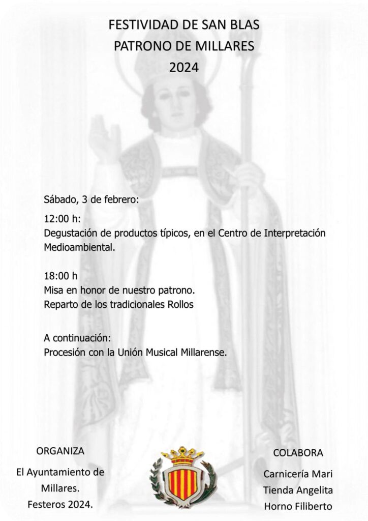 Millares celebra este sábado la festividad de San Blas, patrón de la localidad, con diferentes actos organizados organizados por el Ayuntamiento de Millares y los Festejos 2024.