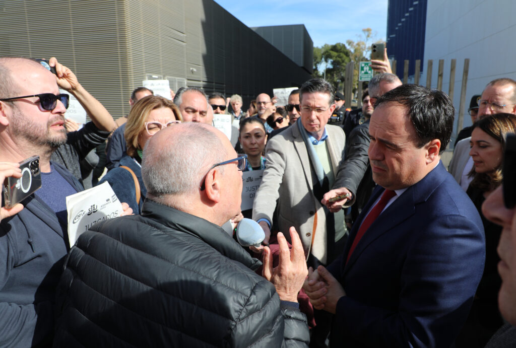 El jefe del Consell, que ha visitado el recién concluido Palacio de Justicia de Llíria, se ha encontrado con un grupo de funcionarios de la Adminsitración de Justicia que le esperaban en la puerta manifestándose por una mejora en las tablas retributivas y ante los cambios organizativos derivados de la implementación de los tribunales de instancia.