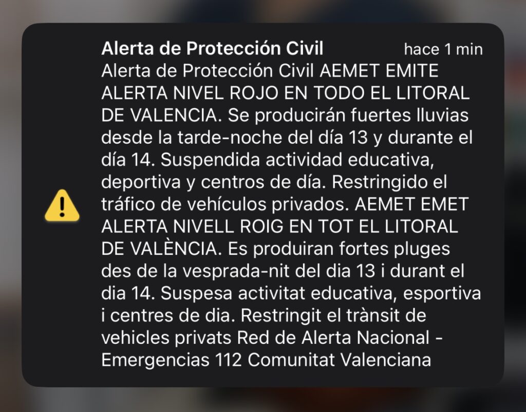 El sistema EsAlert ha enviado este miércoles por la tarde un nuevo mensaje de alerta a la población de los municipios de la zona ya afectados por la dana de hace dos semanas. La notificación ha llegado a muchos ciudadanos a las 19,47 horas y en ella se informa de «ALERTA NIVEL ROJO EN TODO EL LITORAL DE VALENCIA. Se producirán fuertes lluvias desde la tarde-noche del día 13 y durante el día 14. Suspendida actividad educativa, deportiva y centros de día. Restringido el tráfico de vehículos privados».