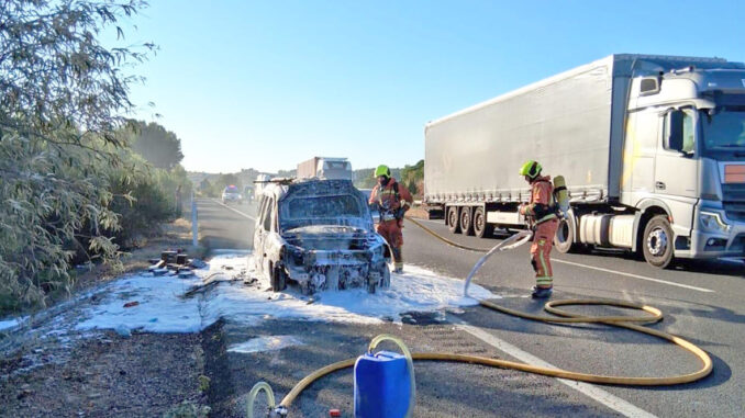 Los bomberos de Requena extinguen el incendio de un vehículo en la A-3 en la zona de El Rebollar