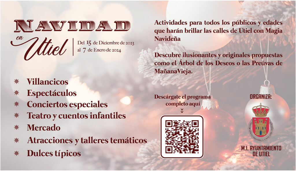 El Ayuntamiento de Utiel ha organizado un programa especial de Navidad con actividades para todos los públicos y edades y  la destacada participación e implicación  de entidades y asociaciones del municipio que harán brillar las calles de Utiel con actividades culturales , lúdicas y festivas para pequeños y mayores.